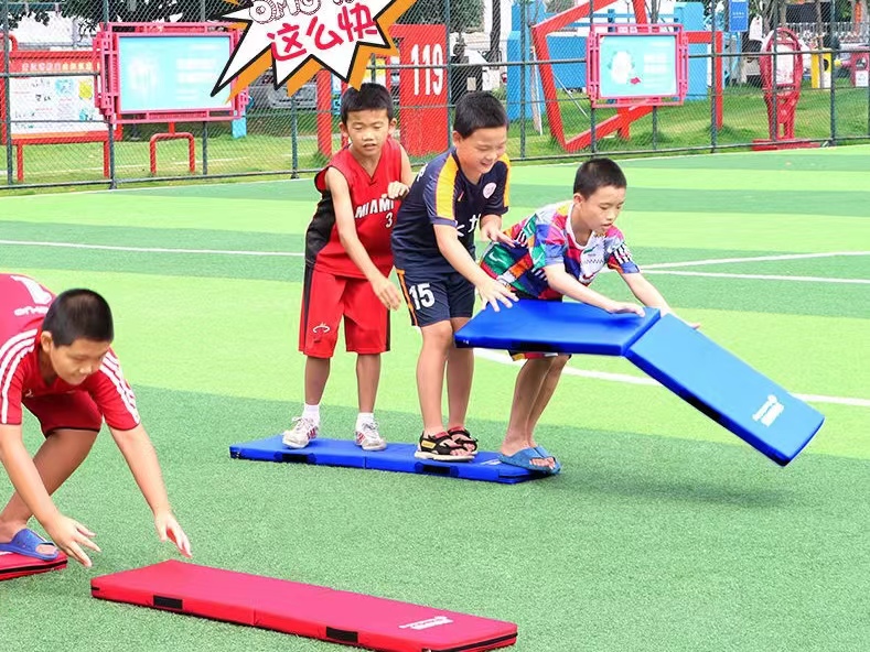 1)本 33名队2 1女或21)持垫站在起点后,有两块垫子1人向前放下第一块垫子,4人依次站在垫子上,脚不能落地,末端1人再将另一块垫子传递给前方队员,前方队员再放下这块垫子,如此逐步向前行进,直至最后一名队员越过20米终点线即完成比赛,以