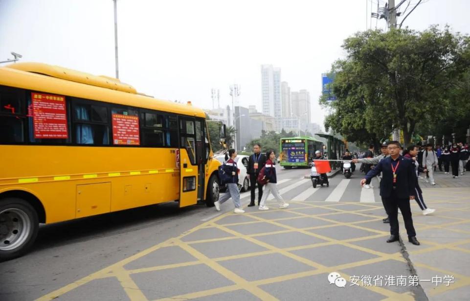 由于淮南一中交通位置特殊,学校周边车流量大,学校门口是自东向西的单行道,每天早晨上学和晚自习放学,学校门口的交通状况会变得异常复杂。学校为了广大同学们的出行安全,联系交警部门在学校门前设置了红绿灯、划定了斑马线和禁停区域,公安部门还专门设置了护学岗亭并安排专人值守。