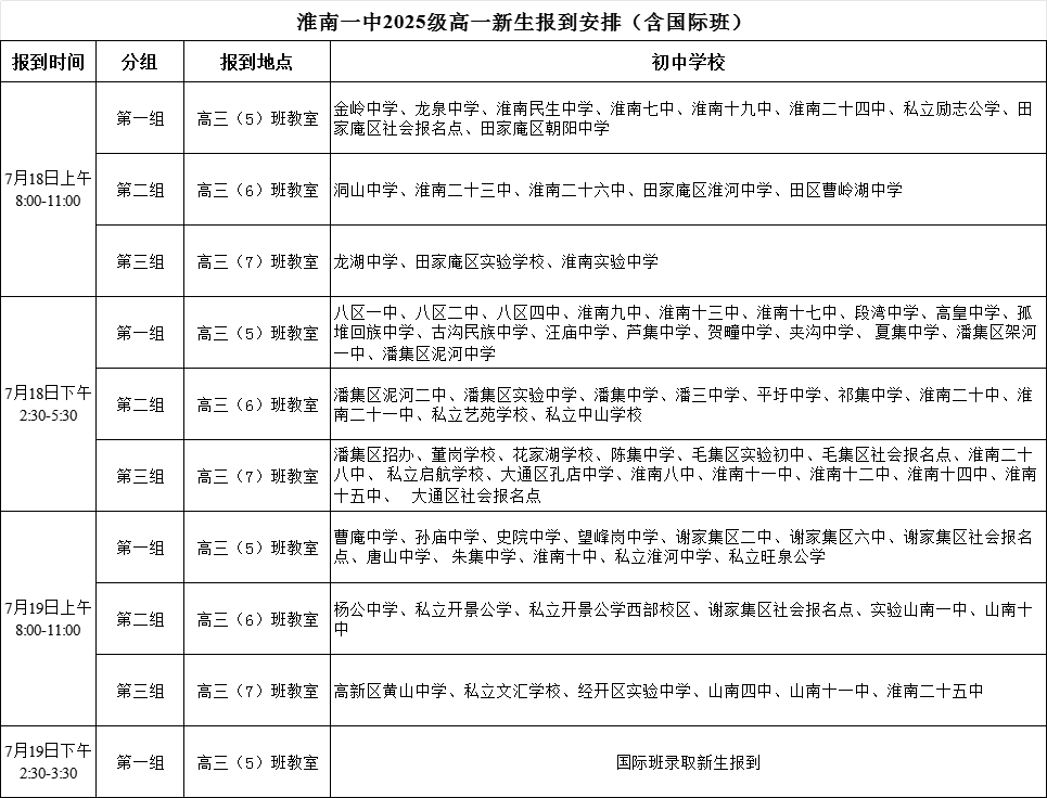 请淮南一中2025级新同学于7月18日——19日到淮南一中报到。具体安排如下: