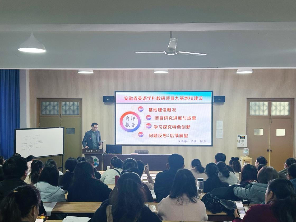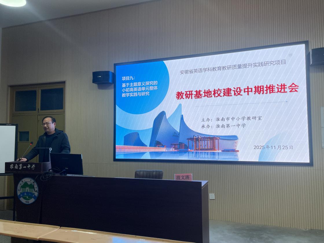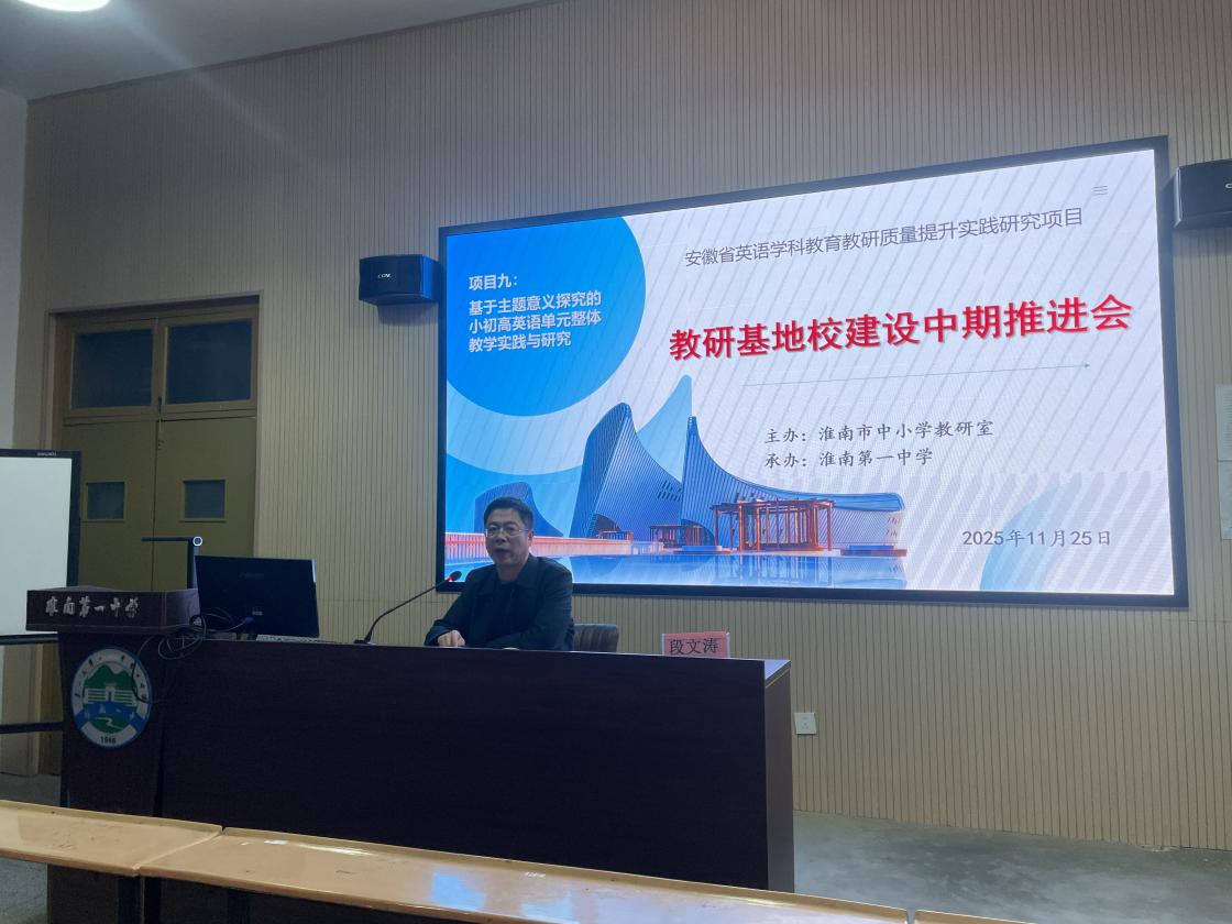 为深化基于主题意义探究的高中英语单元整体教学实践,扎实推进省级英语教研基地校建设进程,凝聚学科教研合力,2025年11月25日下午,由淮南市中小学教学研究室主办、淮南一中承办的省级英语教研基地校建设中期推进活动在我校勤政楼一楼阶梯教室举行。淮南市中小学教学研究室副主任段文涛、淮南一中教研处主任刘登启、各县(区)英语教研员、各高中英语教研组长等共同参加,活动由我校英语教研组长潘静主持。