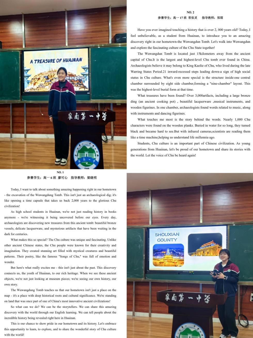 自2024年7月启动基地校建设以来,淮南一中英语教研组对标任务目标,结合我校实情,积极推进理论研究,落实课堂实践,创新学习探究活动。以“走近武王墩,探寻楚文化”为主题,连续举办英语演讲与征文比赛。深度融合本土文化与英语教学,引导学生用英语阐释楚文化内涵,有效提升了学生语言运用能力、文化自信与综合素养,为基地校建设注入实践活力。