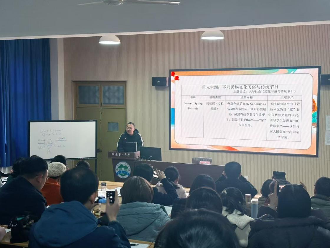 我校英语教研组长牛金带来《以学科育人为核心的英语单元整体教学设计与实践》的专题讲座。讲座围绕育人目标、学情分析、活动设计及多元评价展开,通过结构化知识积累、梯度化学习活动和整合性输出任务,引导学生探究节日文化内涵、增强文化自信,助力语言能力与人文素养的融合发展。讲座构建了“理论解读—案例佐证—实践建议”的完整认知体系,传递了可迁移的教学经验,引发参会者的深度共鸣。